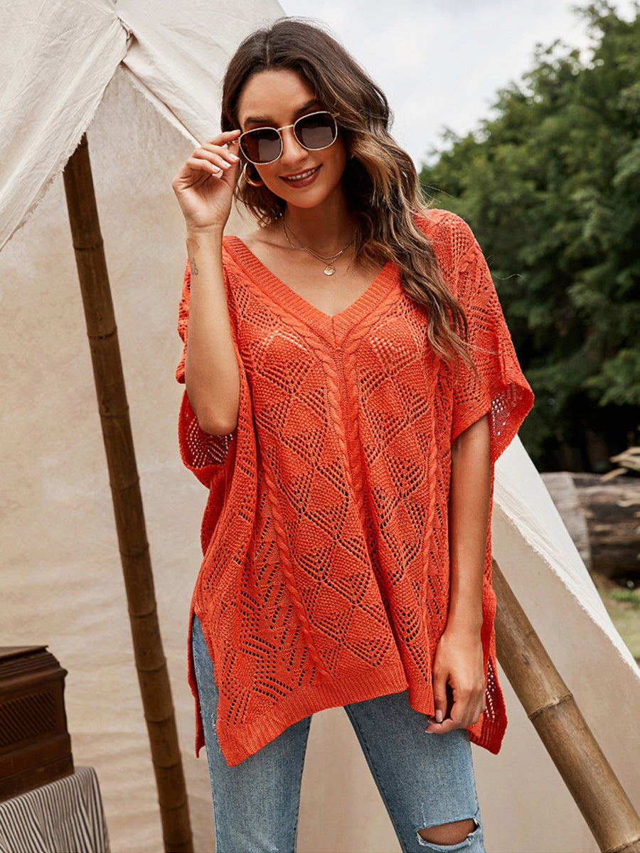 This women's knitted T-shirt features a comfortable loose fit. solid color design. and a stylish V-neck pattern with hollowed-out details. Crafted with breathable. lightweight fabric. it provides great range of motion and ventilation. perfect for any activity.