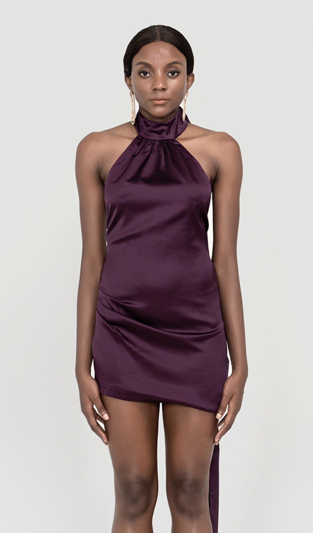 Our mini dress is draped. gathered and elegant to create an ultra-feminine silhouette. We love the strappy open back that drapes beautifully down to the waist and the high wrap neck has an elegant tie collar that gently flows down the back. It is fully lined for a smooth finish.
